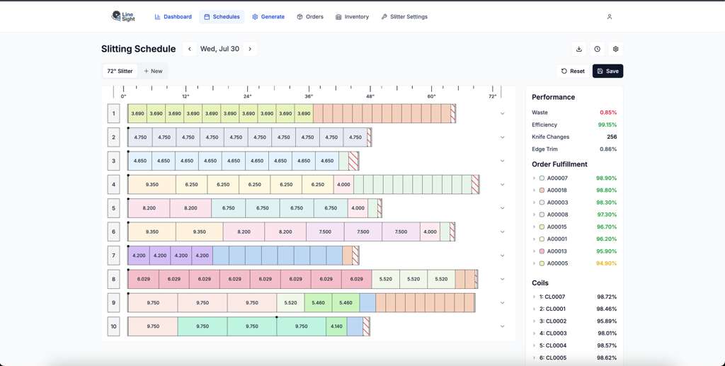 LineSight's AI analyzes your orders and inventory to generate optimized slitting patterns in minutes — cutting waste, boosting throughput, and fulfilling orders faster.